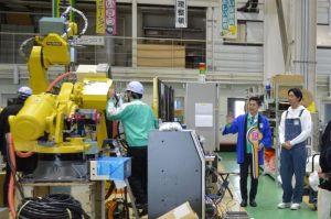 ロボット組立工場にて、「なぞっちょさん」と「福本アナウンサー」との掛合いの様子