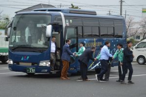 桜舞い散る中にこやかにお出迎え。